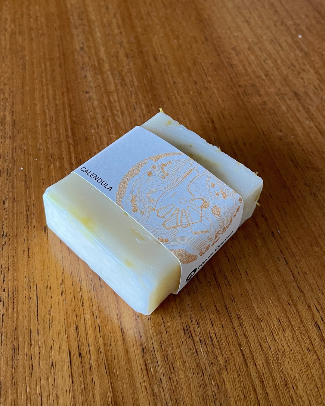 Svært mild håndlaget såpe laget av økologisk oliven- og kokosolje. Med beroligende ringblomstolje og ringblomstblader.