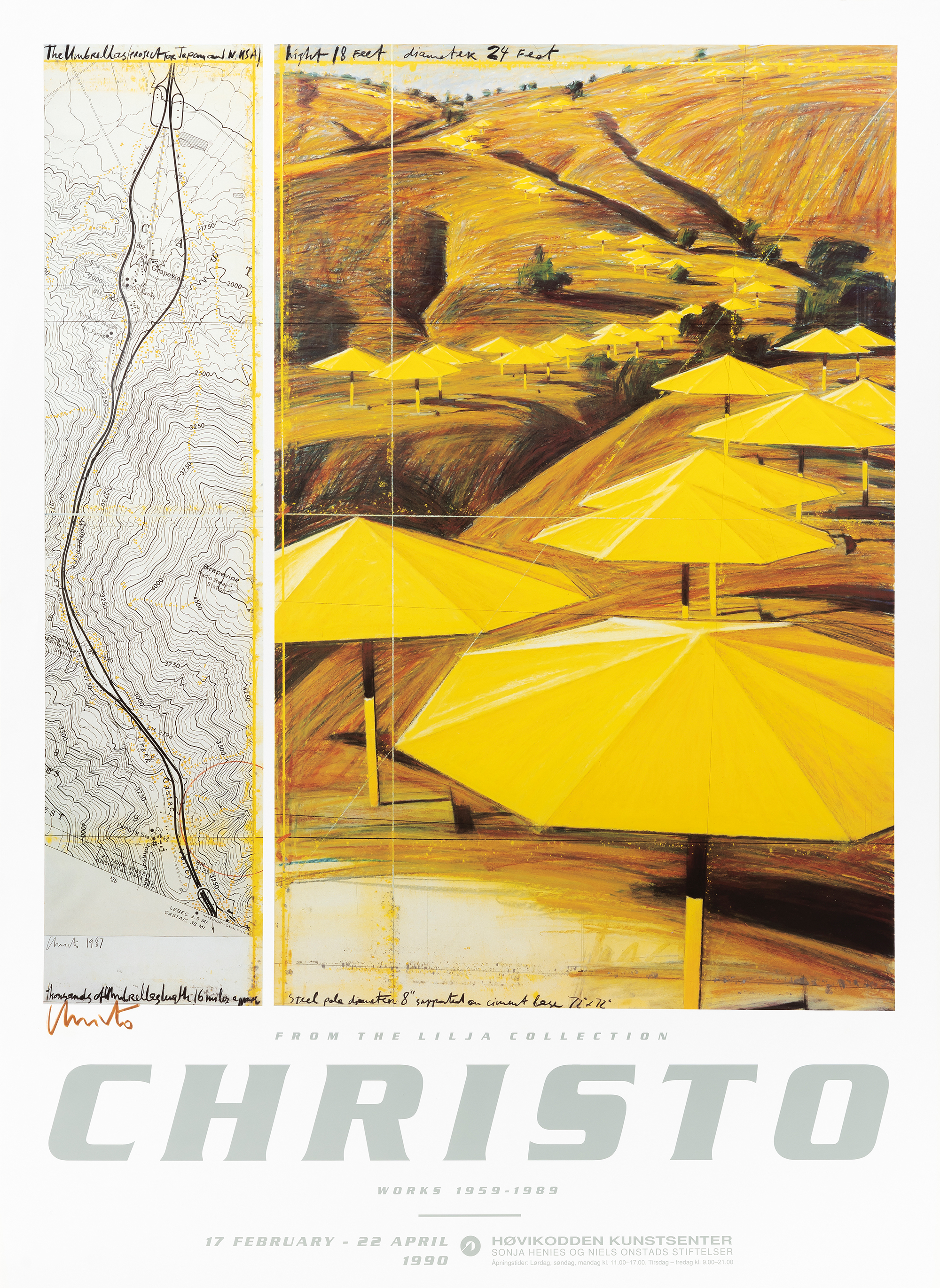 Utstillingsplakat fra utstillingen Christo verker fra The Lilja Collection vist på Henie Onstad Kunstsenter, 1990. Motivet er The Umbrellas, Project for Japan and Western USA, 1987.